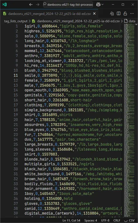 **danbooru_****e621_**merged - a merge of both Danbooru and e621 tags (best for NoobAI/Pony based models especially if you plan on using e621 stuff and your extension doesn't support loading multiple tag lists at once)