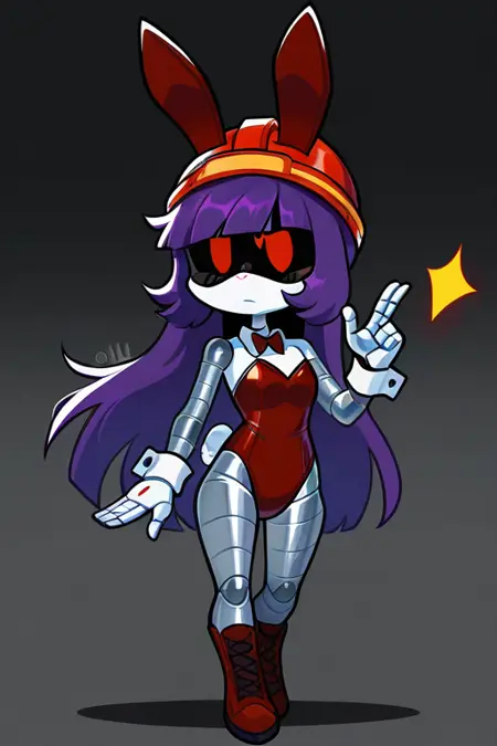 提示词:D0ll,紫色头发,橙色眼睛,机器人,面罩,红色头盔,红色短上衣,黑色背心,红色裙子