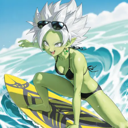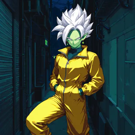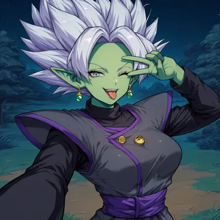 Looks tags: colored skin, green skin, spiked hair, white hair, super saiyan, grey eyes, pointy ears, potara earrings, green earrings