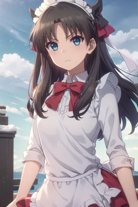 rin tohsaka, aqua eyes, black hair, hair ribbon, long hair, ribbon, sidelocks, two side up,