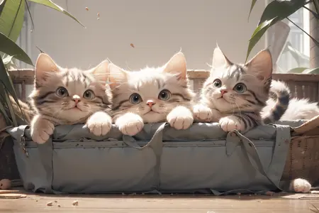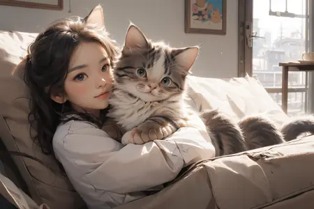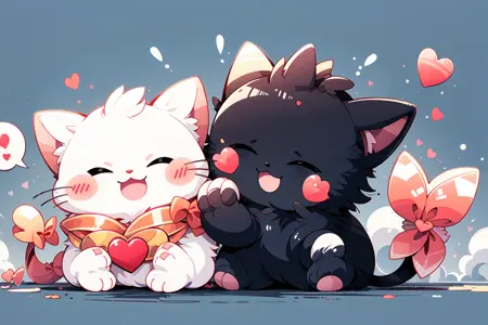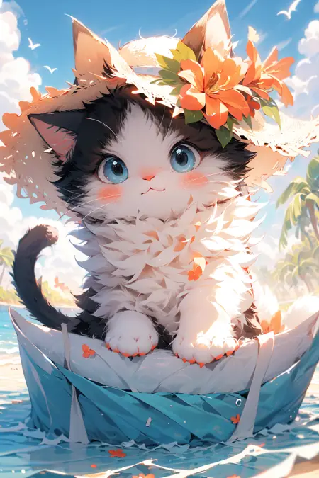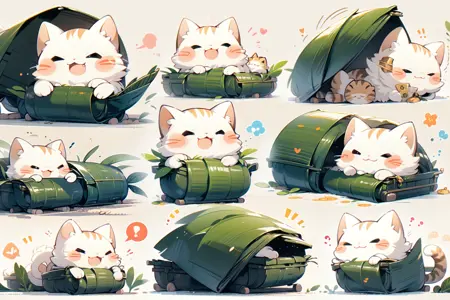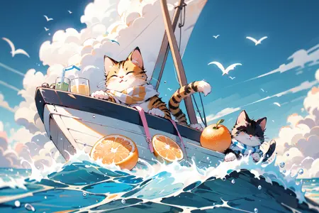 我找了许多MidJourney二次元模型生成的猫猫图片,训练了这个模型,效果还是蛮不错的,画风还原得很好,猫猫也很可爱,很容易就能出效果,触发词只要输入“cat”就可以。之后我尝试了各类模型,适配性也不错,但有一定几率画出多余的腿,建议权重不要太高,0.5–0.9之间为佳。推荐的tag如下: