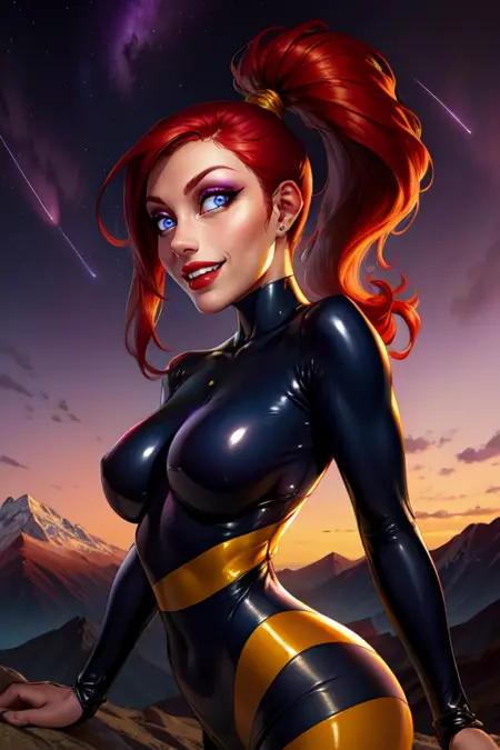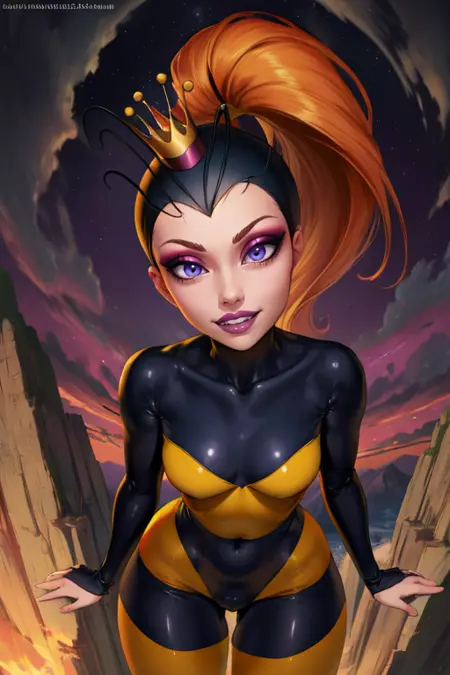 노란색 줄무늬 바디수트, 피부에 딱 붙는, 하이힐, 검정 두건, 작은 왕관, 머리 안테나,