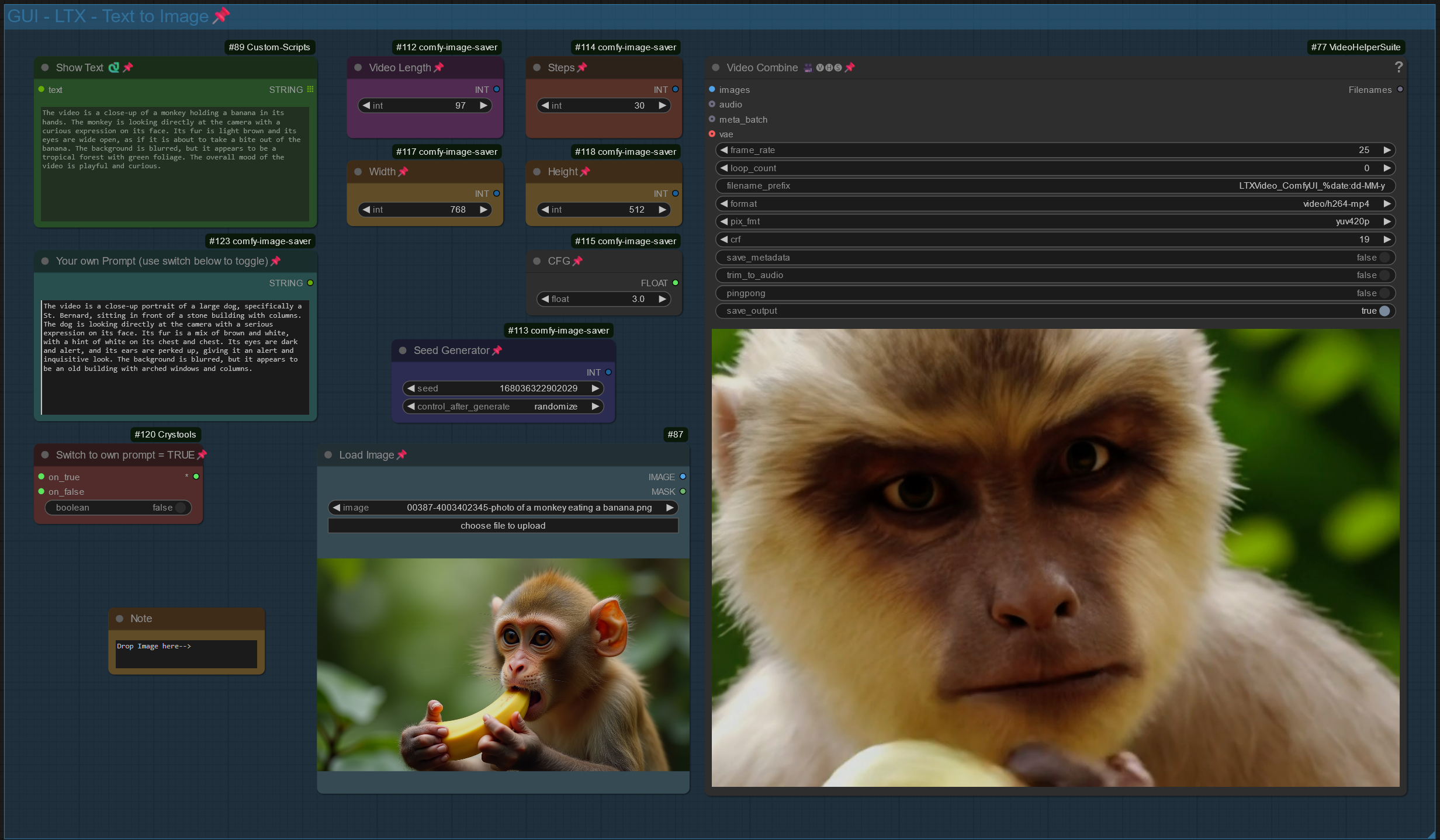 Workflow: Input Image (or prompt) -> captioning to a text prompt -> prompt is used for LTX TEXT to VIDEO (this is a Text to Video workflow, see my other workflow for Image to Video)