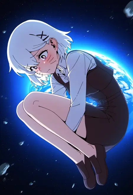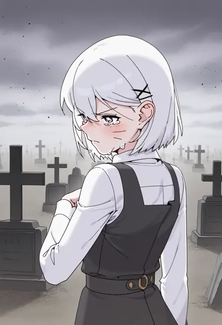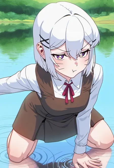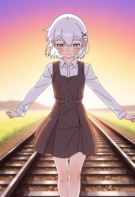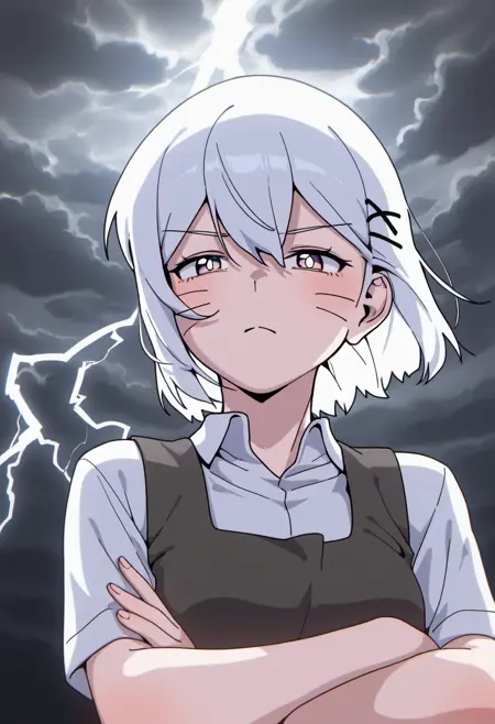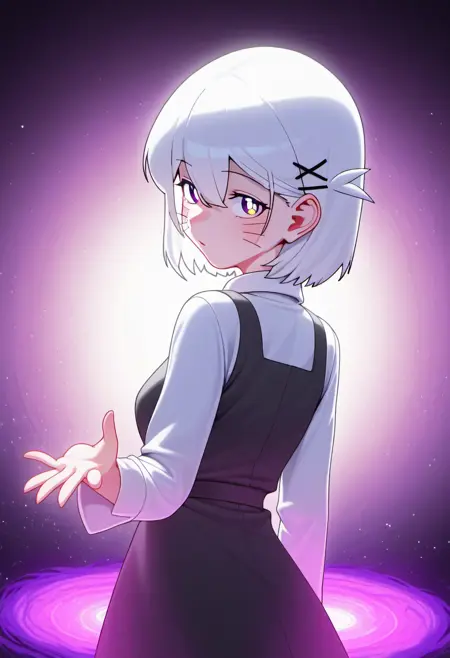 General Prompts: white hair, hair between eyes, x hair ornament, hairclip, purple eyes, whiskers, bright pupils, white pupils