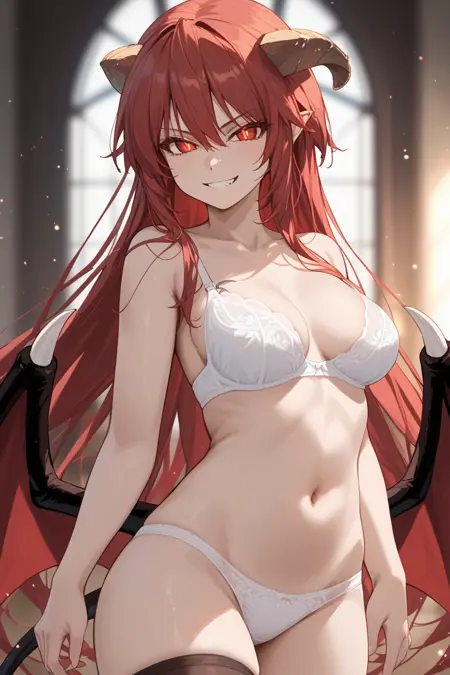 Astaroth, red hair, long hair, red eyes, demon girl, pointy ears, horns, slit pupils, bat wings, low wings, demon tail, body tattoo,