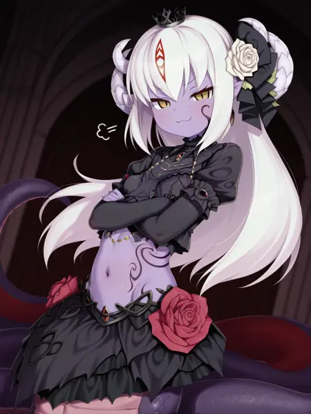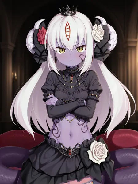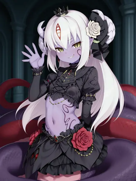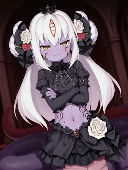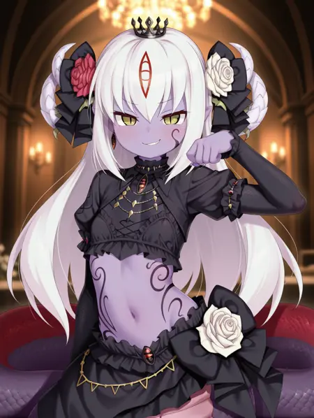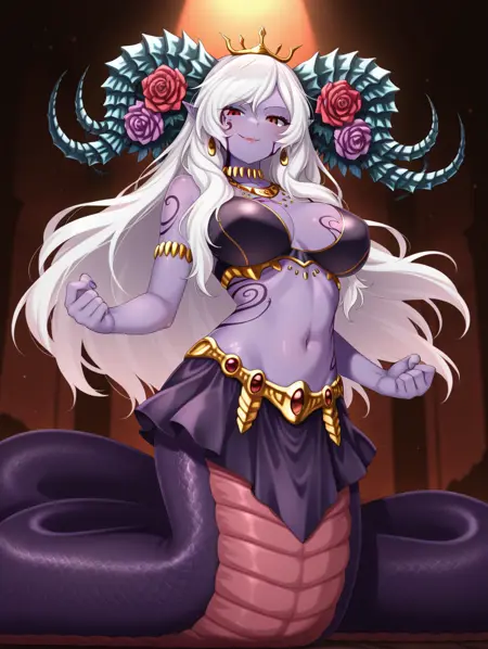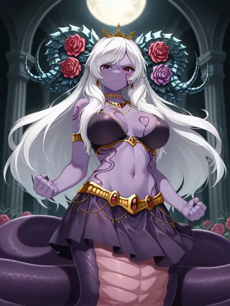 Alice_I_Goddess、白髪、長い髪、ラミア、赤い目、胸のタトゥー、モンスターガール、蛇娘、紫のタトゥー、尖った耳、角、色付きの肌、紫の肌、縦の瞳孔、うろこ、顔のタトゥー、ジュエリー、髪飾り、赤い花、紫の薔薇、耳飾り、王冠、腹部、ブラ、スカート、大きい胸、