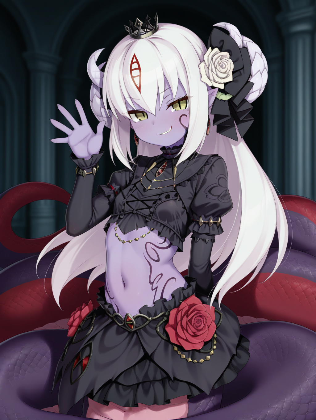 Alice_I、白髪、長い髪、ラミア、黄色い目、モンスターガール、蛇娘、紫のタトゥー、尖った耳、角、色付きの肌、紫の肌、縦の瞳孔、(うろこ)、顔のタトゥー、ジュエリー、髪飾り、赤い花、白い薔薇、耳飾り、王冠、腹部、(黒いシャツ)、スカート、