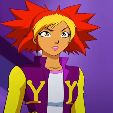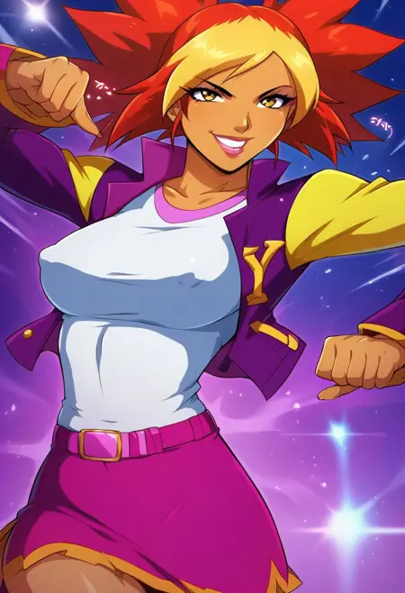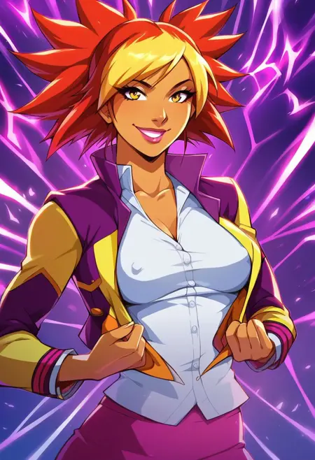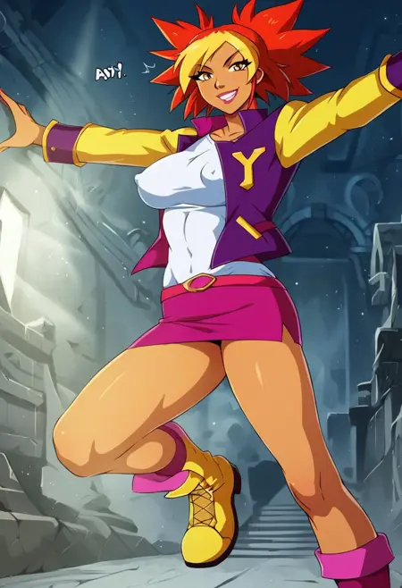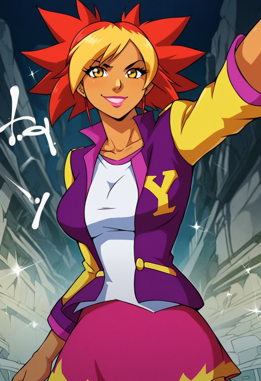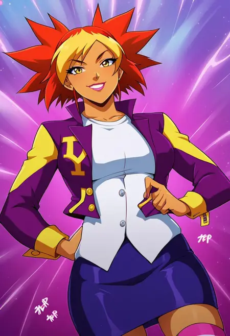 YokoTG、1girl、solo、複色の髪、金色と赤髪、黄色い目、唇、リップスティック、メイク、大きな胸、細身の女の子、日焼けした肌、トゲトゲの髪、染めた前髪、紫と黄色のジャケット、ベルト、スカート、白いシャツ、黄色いブーツ、ベスト、ストライプの太ももハイソックス