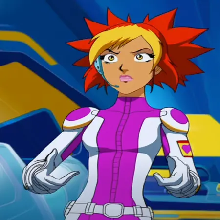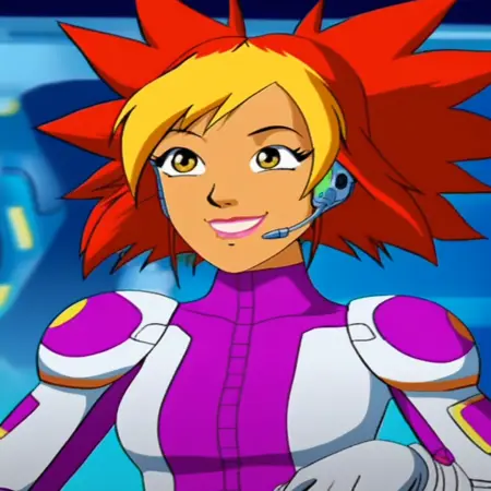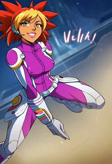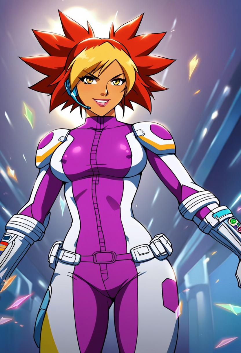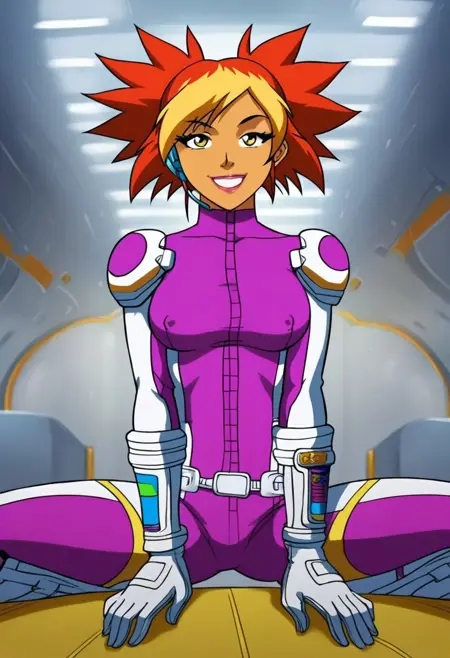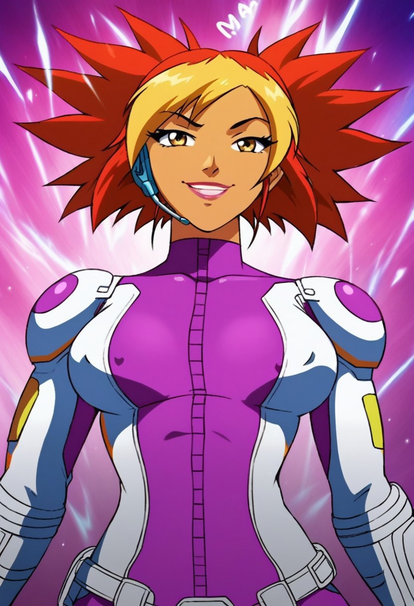 YokoTG、1girl、solo、複色の髪、金色と赤髪、黄色い目、唇、リップスティック、メイク、大きな胸、細身の女の子、日焼けした肌、トゲトゲの髪、染めた前髪、ボディスーツ、ヘッドセット、手袋、ベルト、靴、紫と白のボディスーツ、