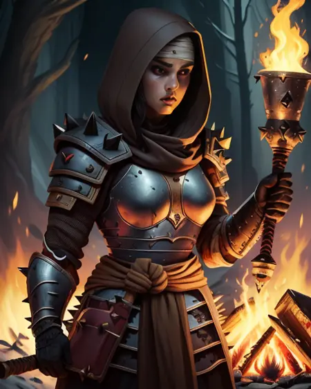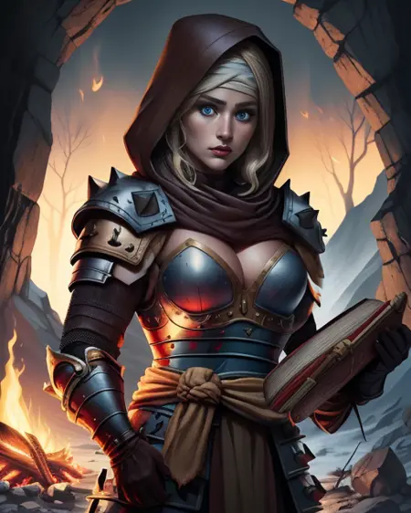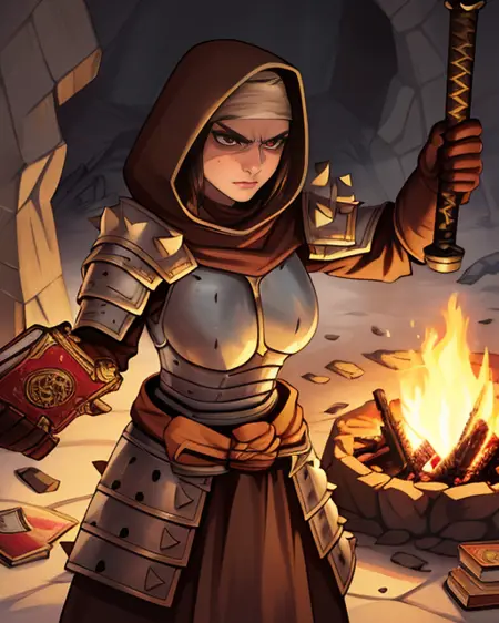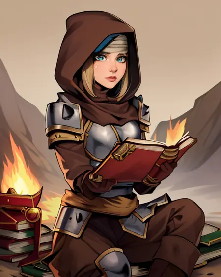 headband, pauldrons ,brown gloves, breastplate, pauldrons, habit, armored boots,