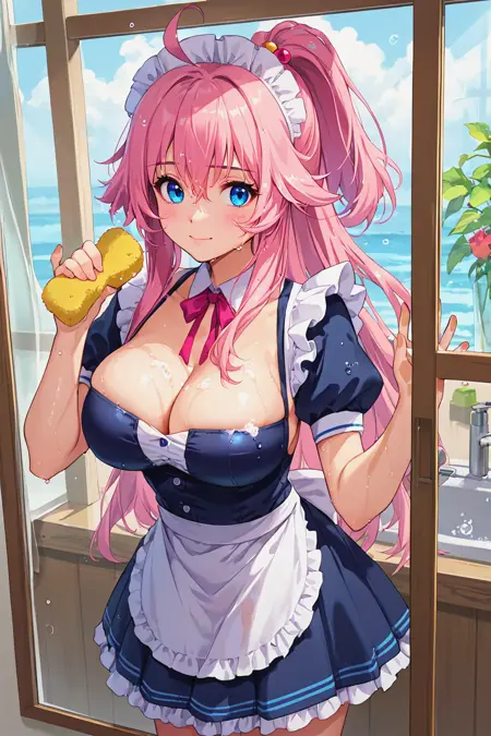 , aota natsu, long hair, ahoge, hair bobbles, pink hair, blue eyes, large breasts,