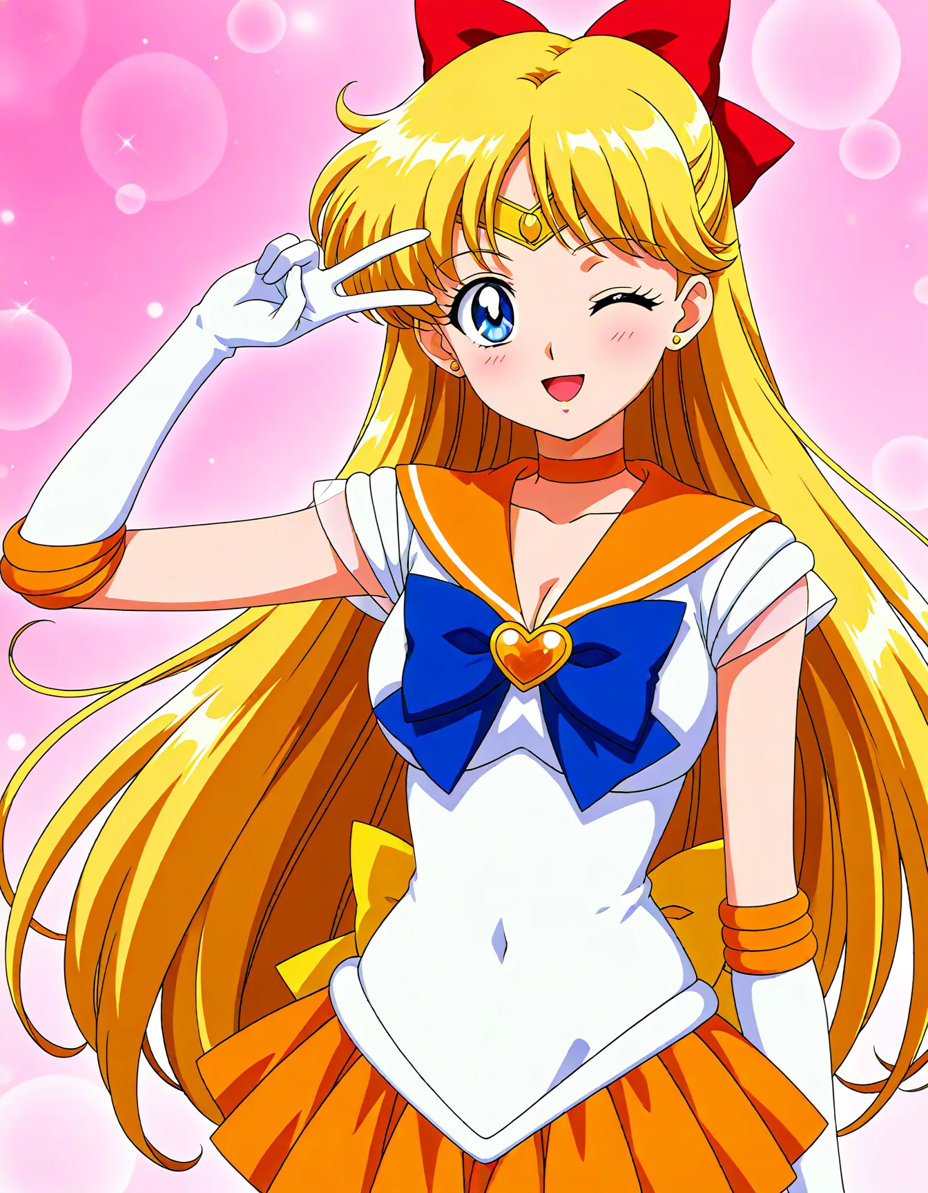 triggerWord: aino minako,1girl,blonde hair,blue eyes,bow,red hair bow,half updo,long hair,red bow,tiara,yellow back bow,choker,elbow gloves,gloves,jewelry,magical girl,orange choker,orange sailor collar,orange skirt,sailor collar,sailor senshi uniform,skirt,white gloves,,orange footwear,