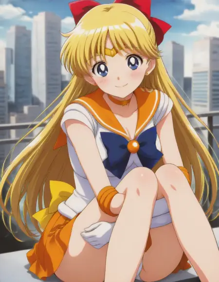 触发词:aino minako, 1girl, 金色头发, 蓝色眼睛, 蝴蝶结, 红色发带, 半扎发, 长发, 红色蝴蝶结, 王冠, 黄色背部蝴蝶结, 项圈, 肘部手套, 手套, 珠宝, 魔法少女, 橙色项圈, 橙色水手领, 橙色裙子, 水手领, 水手战士制服, 裙子, 白色手套, 橙色鞋履,