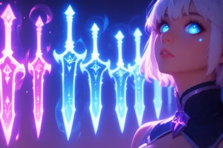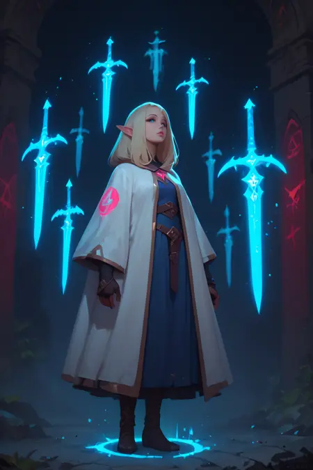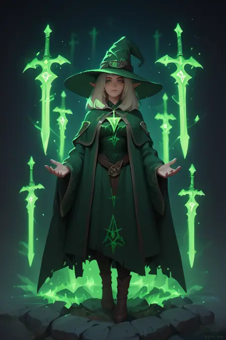 "score_9, score_8_up, score_7_up, upscale 2x, (A cinematic full body shot of a fantasy female elf witch in a white and green witch hat, blonde hair, green eyes, casting a spell to summoning multiple green floating swords above her head:1.4) sword dance"