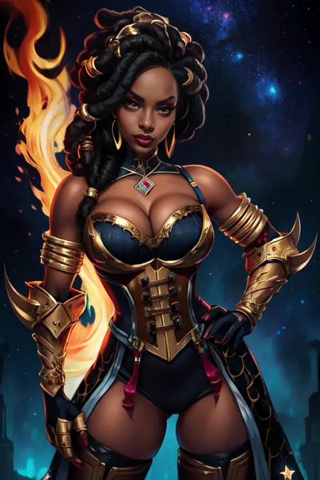 ImGear、ガントレット、肩出し、黒色のアーマー、黒色のタイツ、ハイヒール、胸元、ゴールドのジュエリー、イヤリング、