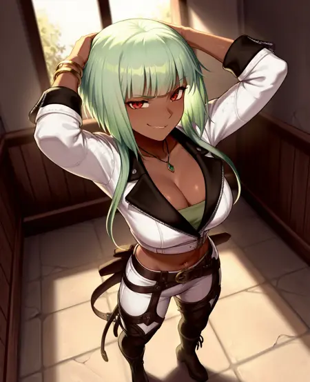 Atlas Outfit: AtlasOutfit, necklace, cleavage, white jacket, midriff, white pants, black collar, belts, bracelet, black boots, chaps zippers, ankle zippers, white pants under boots