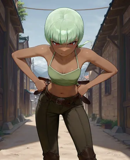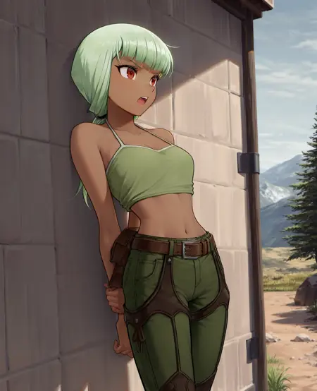 Flashback Outfit: FlashbackOutfit, olive tank top, bare shoulders, green pants, belt, midriff, halterneck, brown shoes