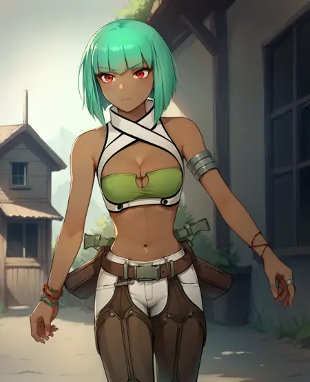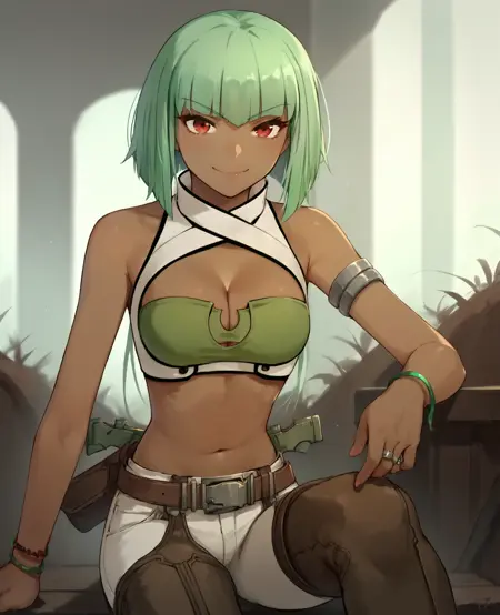Appearance: EmeraldSustrai, 1girl, dark-skinned female, red eyes, green hair, short hair, long back locks, blunt bangs