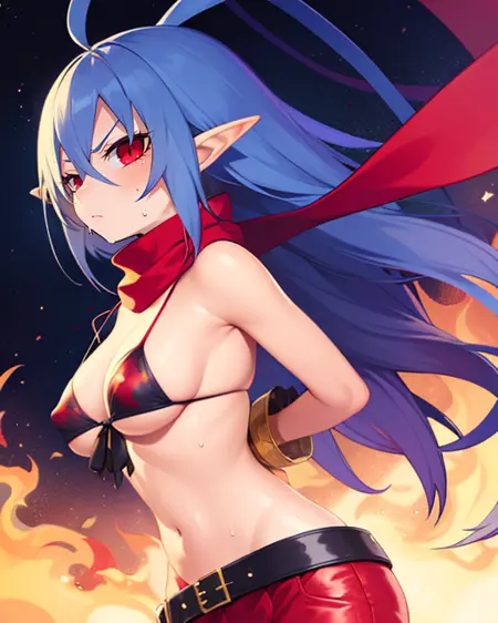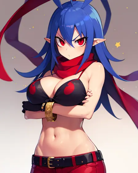 GirlLaharl, 긴 파란 머리, 안테나 머리, 붉은 눈, 날카로운 귀, 좁은 동공, 배꼽, 붉은 스카프, 팔을 교차함