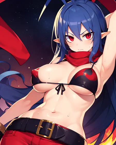 Laharl, long blue hair, antenna hair, red eyes ,pointy ears ,slit pupils, navel,red scarf,