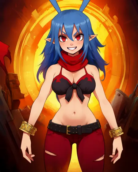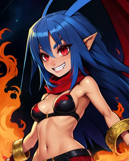 GirlLaharl、長い青髪、アンテナ髪、赤い目、尖った耳、縦長の瞳孔、へそ、赤いスカーフ、腕を組む