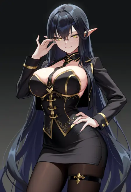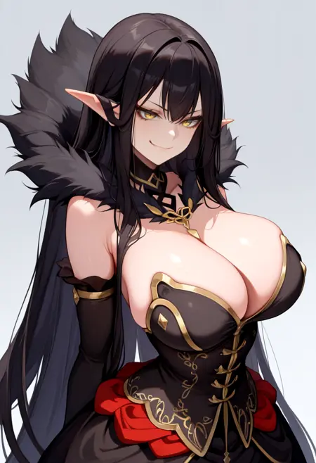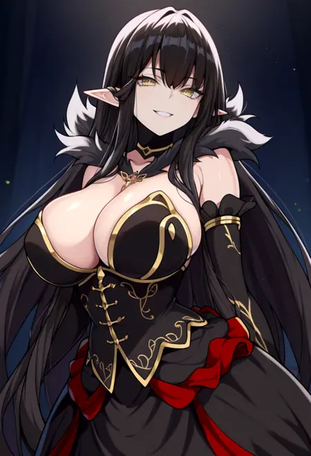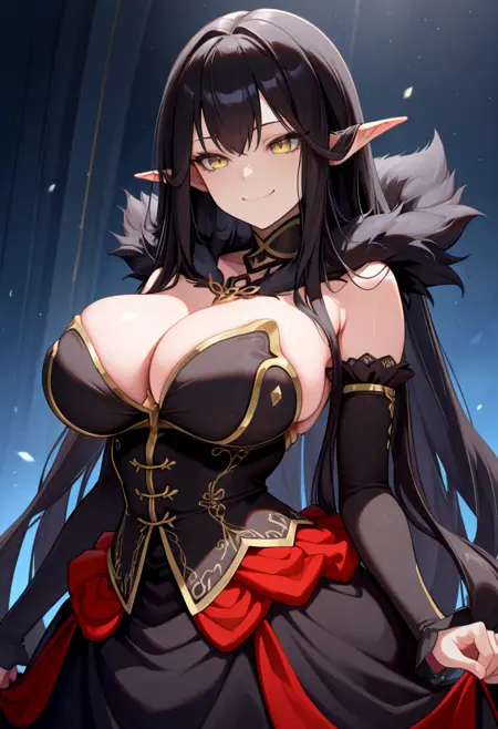 プロンプト: ballgown, black hair, corset, detached sleeves, big breasts, pointy ears, very long hair, yellow eyes, gold trim, black dress, red trim, hair between eyes, strapless, fur collar,