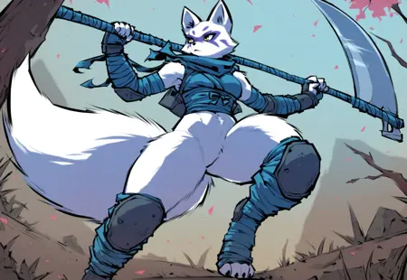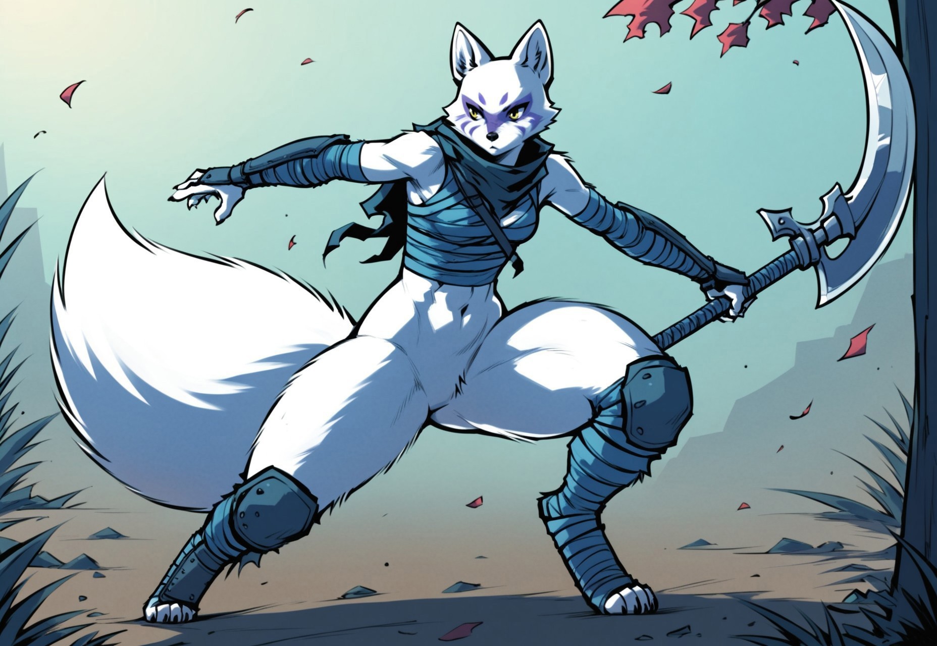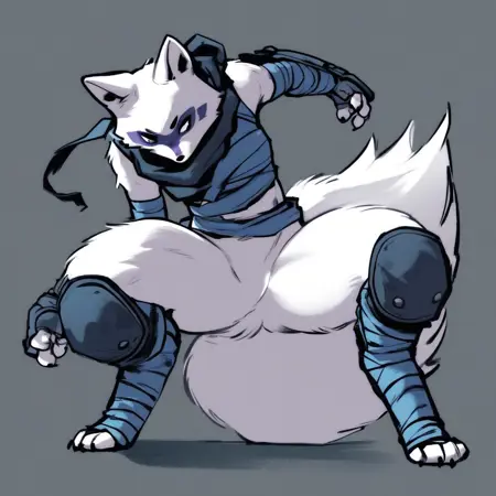 anthro, artic fox, bandages, ninja outfit, bottomless. featureless crotch, knee pads, arm guard, leg wraps, fluffy thighs