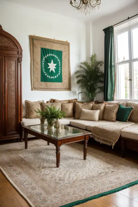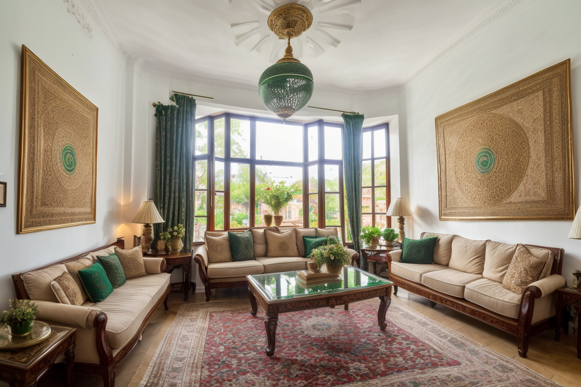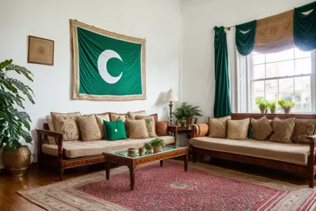 試す:広角写真、uk-pk-lounge、人物なし、{レザー|} ソファ、風景、カーペット、ラグ、植物、窓、屋内、テーブル、クッション、ランプ、カーテン、木製床、本、絵画(オブジェクト)、花、花瓶、静物、鉢植え、ベッド、椅子、クッション、星(シンボル)、壁の家族写真、{パキスタン|インド|バングラデシュ} 飾り、(london:1.1)、モダンシック、lora:EnhancedDetail:0.7、傑作、最高品質、absurdres、高解像度、4k、繊細な細部、非常に詳細、(緑のパキスタン国旗と白い三日月:1.1)、{鮮やか|明るい|パステル} 色調、土着の自然モチーフ、エスニックな雰囲気、南アジアと英国のテーマ