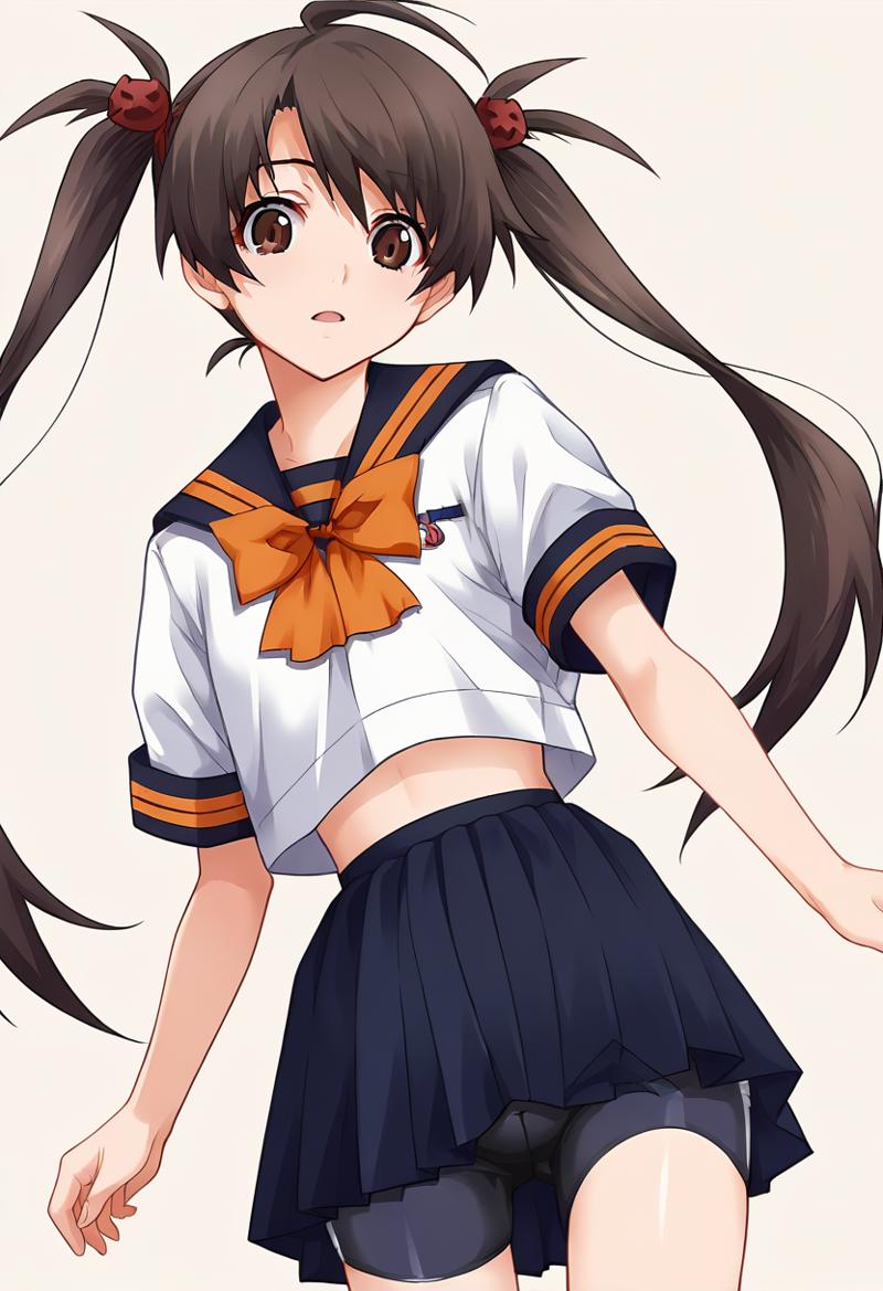 Clothing 2: white serafuku, orange bowtie, sailor collar, short sleeves, blue miniskirt, bike shorts, shorts under skirt,