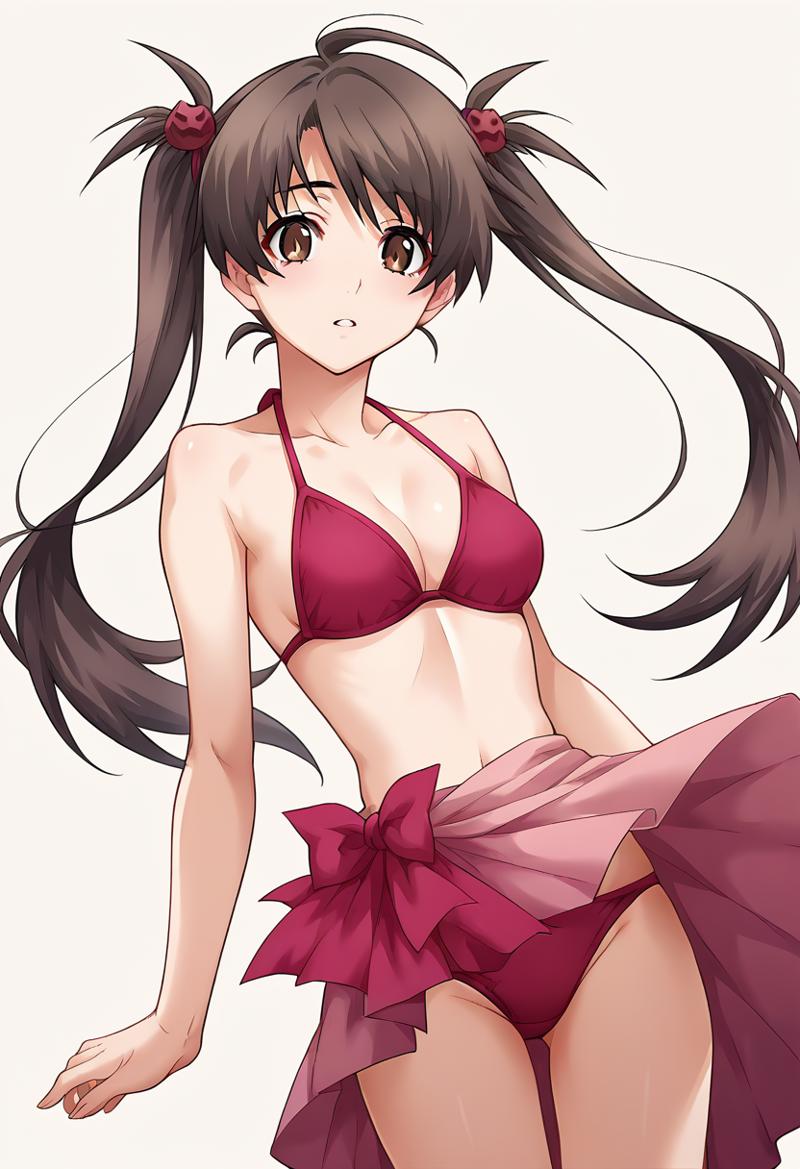 score_9, score_8_up, score_7_up, score_6_up, score_5_up, score_4_up, masterpiece, source_anime, 1girl, c notoya, medium breasts, brown hair, brown eyes, long hair, twintails, hair ornament, ahoge, pink bikini, pink sarong, simple background, beige background, dutch angle, looking at viewer,