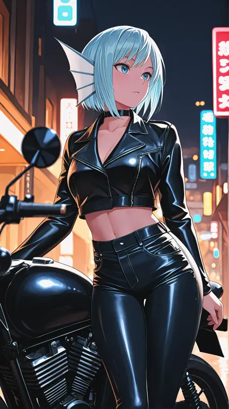 short hair, blue hair, blue eyes, head fins, white sailor hat, sailor outfit, sleeveless, white shirt, sailor collar, red neckerchief, dark blue skirt, white wrist cuffs, black gloves, leggings,