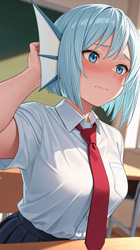 short hair, blue hair, blue eyes, head fins, white sailor hat, sailor outfit, sleeveless, black gloves, black skirt, sailor collar, red neckerchief, wrist cuffs, black thighhighs