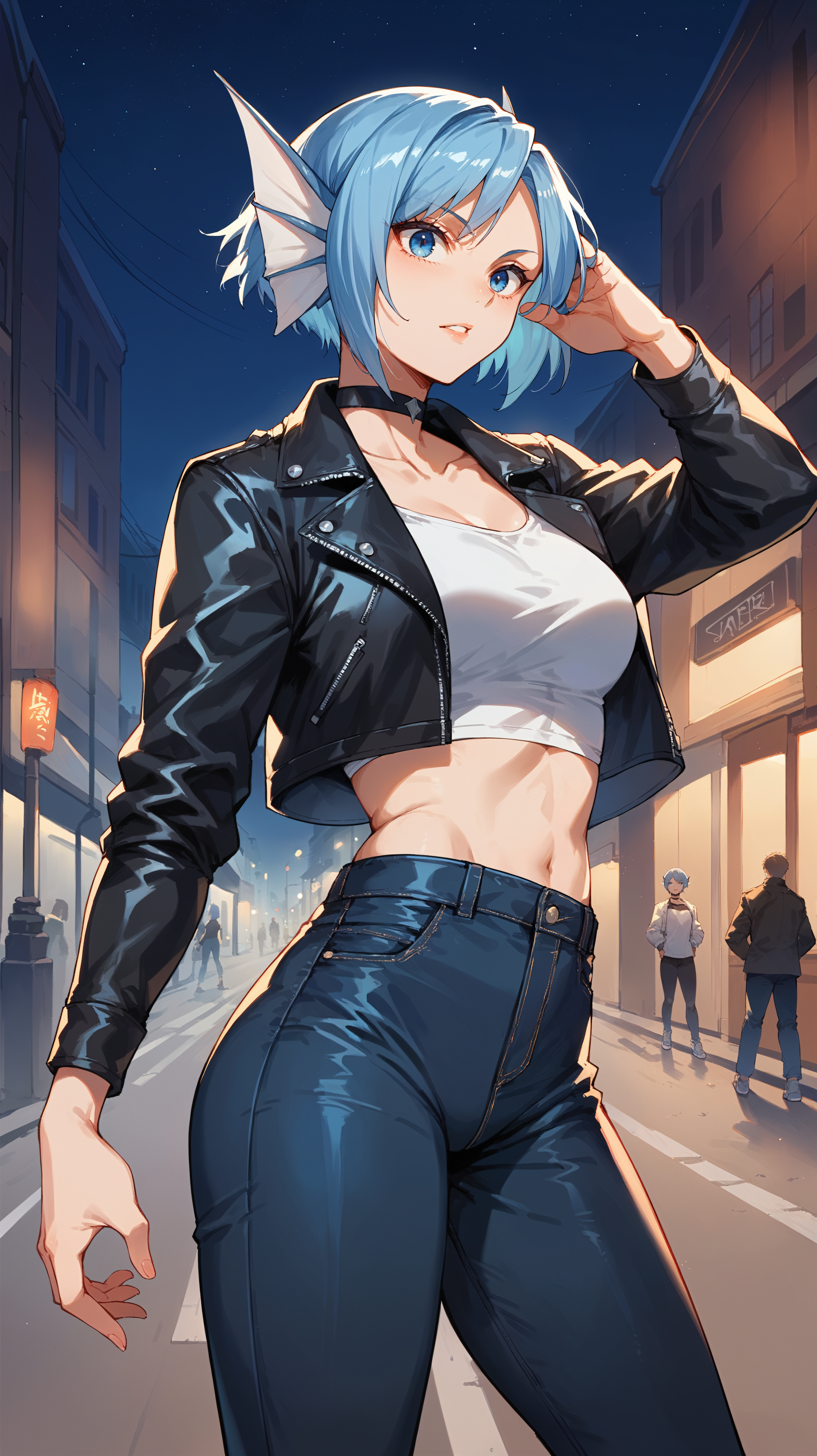 짧은 머리, 파란 머리, 파란 눈, 머리 지느러미, 흰색 선원 모자, 선원 복장, 민소매, 흰색 셔츠, 선원 칼라, 빨간 넥커치프, 진한 파란 치마, 흰색 손목 팔찌, 검은 장갑, 레그gings,