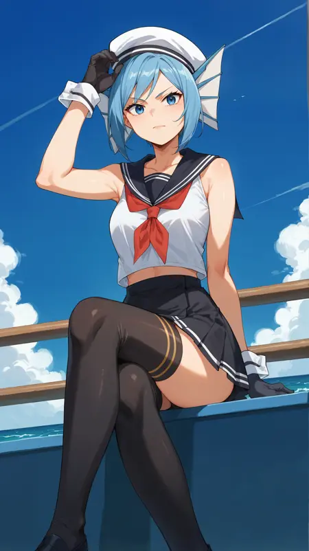 짧은 머리, 파란 머리, 파란 눈, 머리 지느러미, 흰색 선원 모자, 선원 복장, 민소매, 검은 장갑, 검은 치마, 선원 칼라, 빨간 넥커치프, 손목 팔찌, 검은 허벅지 스타킹