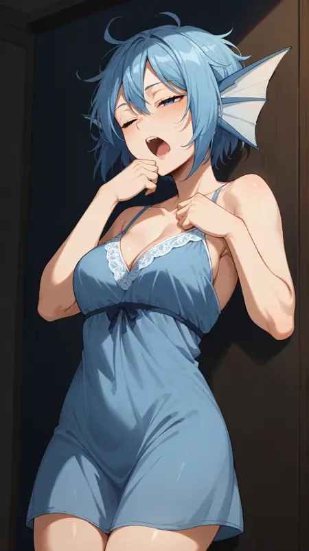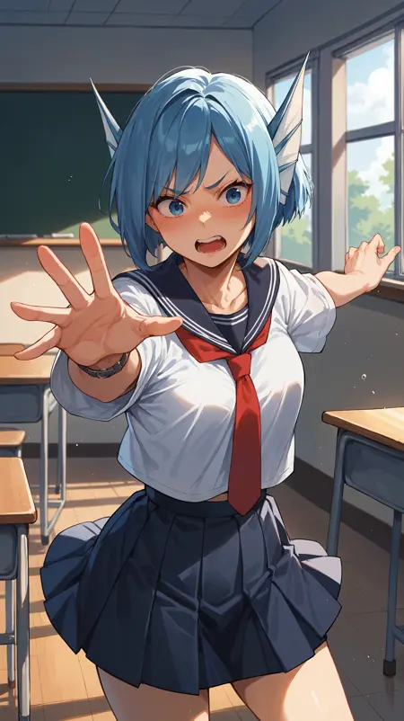 짧은 머리, 파란 머리, 파란 눈, 머리 지느러미, 흰색 선원 모자, 선원 복장, 민소매, 흰색 셔츠, 선원 칼라, 빨간 넥커치프, 진한 파란 치마, 흰색 손목 팔찌, 검은 장갑, 레그gings,