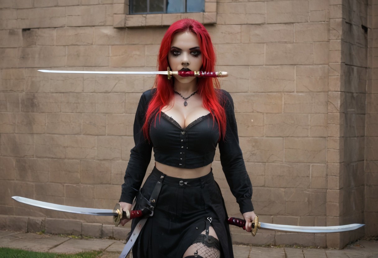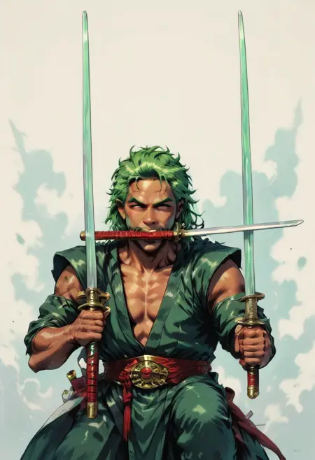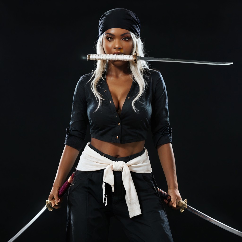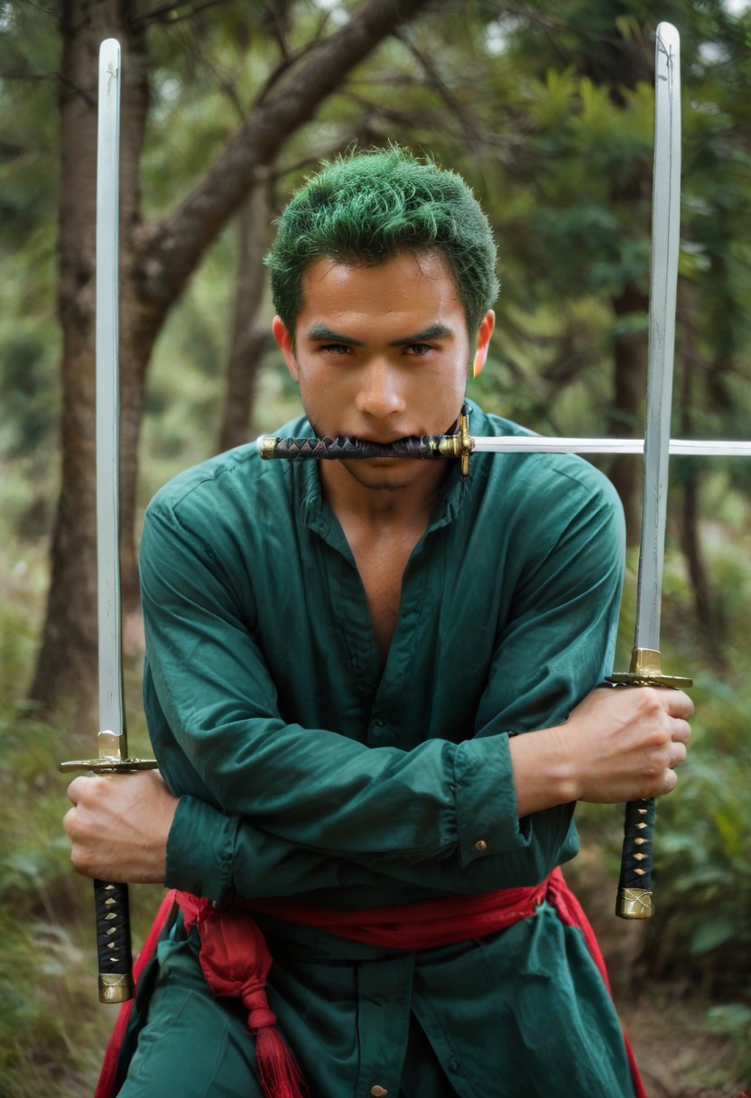 3SwordsStyleV1, holding object in mouth, holding in mouth, mouth hold, sword in mouth, weapon, holding weapon, holding, holding sword, 3swords, dual wielding, 3 weapons, 3 swords, weapon, sword