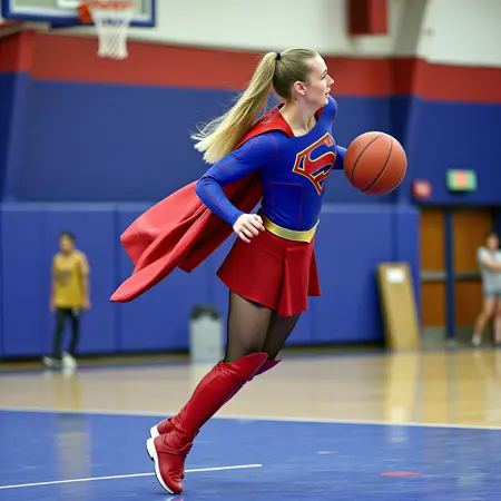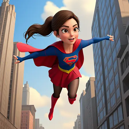 트리거 단어(프롬프트에 반드시 포함해야 함): 파란색 sg 셔츠에 'S' 문양과 빨간색 스티칭 라인, 빨간색 sg 망토, 금색 sg 벨트, 빨간색 sg 치마, 검은색 sg 스타킹, 빨간색 sg 부츠를 착용한