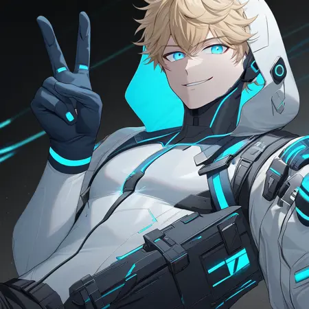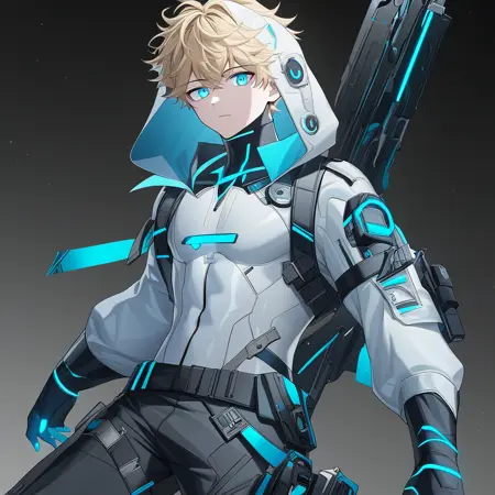 可选触发词:浅金色头发,短发,淡蓝色眼睛,白皙皮肤,白色斗篷,未来感白色紧身衣上衣,带有发光蓝色装饰,斗篷下垂,黑色长裤配蓝色装饰,黑色手套配蓝色装饰,背部携带着一把大型黑蓝白配色的枪,高黑色衣领