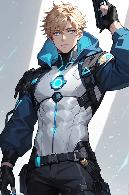 옵션 트리거 단어: 연한 금발, 단발, 연한 파란 눈, 밝은 피부, 흰색 후드, 푸른색 하이라이트가 빛나는 미래형 흰색 바디수트 상의, 후드 내려짐, 푸른색 하이라이트가 있는 검은 바지, 푸른색 하이라이트가 있는 검은 장갑, 등에 큰 검은색, 파란색, 흰색 총