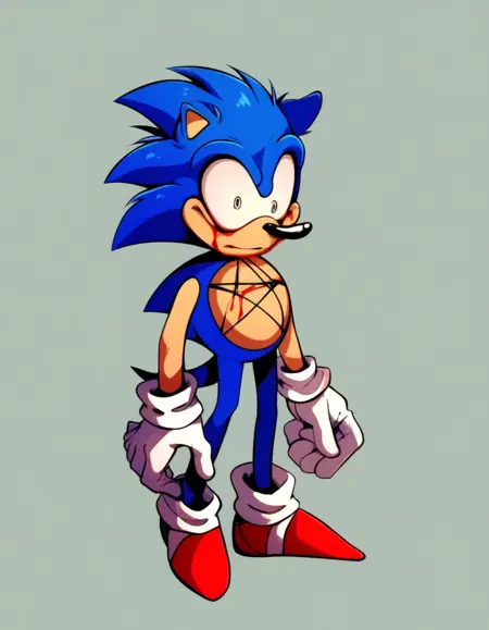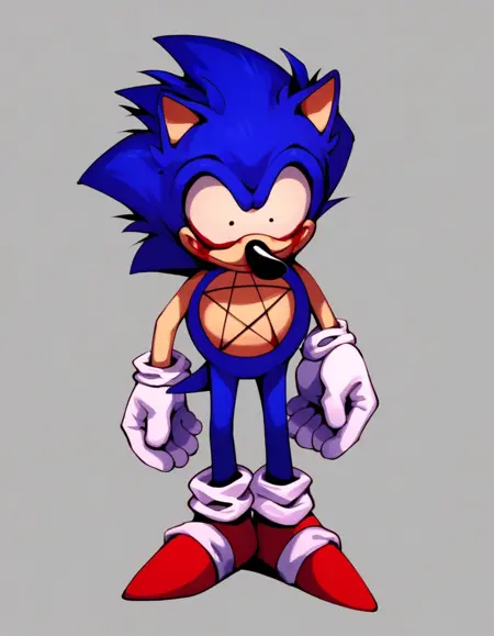 SatanosEXE, gloves, 1boy, animal ears, blue hair, tail, shoes, socks, white gloves, blood, spiked hair, red footwear, furry, injury, wide-eyed, furry male, body fur, constricted pupils, animal nose, two-tone fur, blue fur, sonic the hedgehog, horror