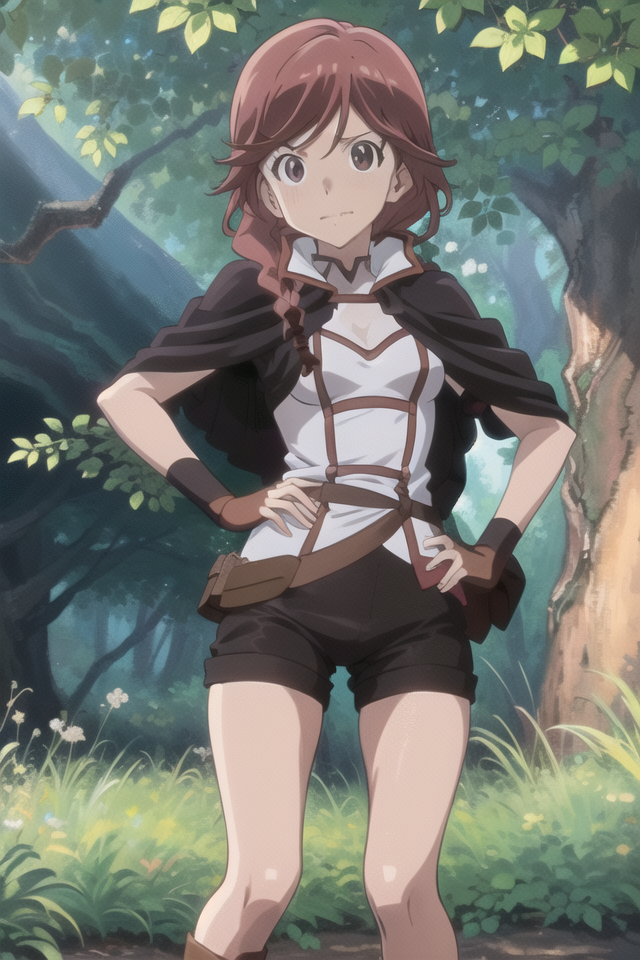 yume1, thighhighs, fingerless_gloves, boots, cape, red_hair, single_braid, brown_eyes,