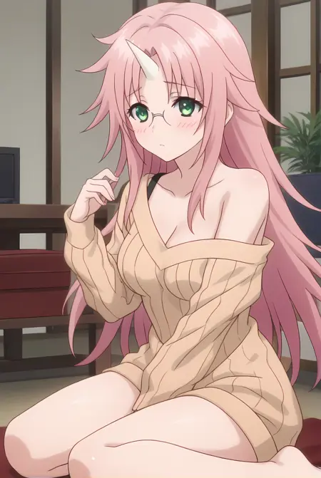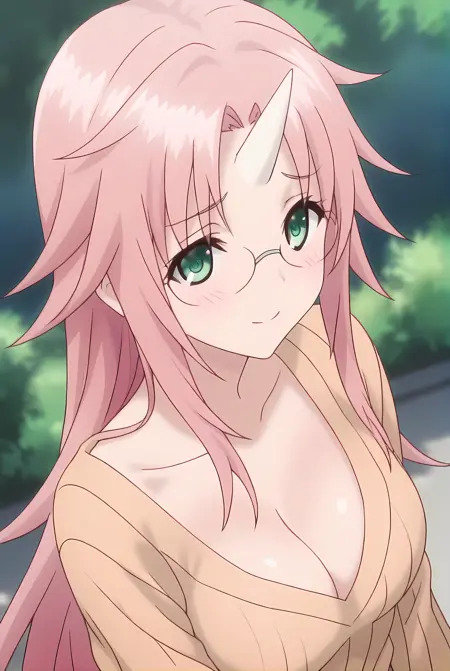 분홍색 머리, 긴 머리, 녹색 눈, 안경