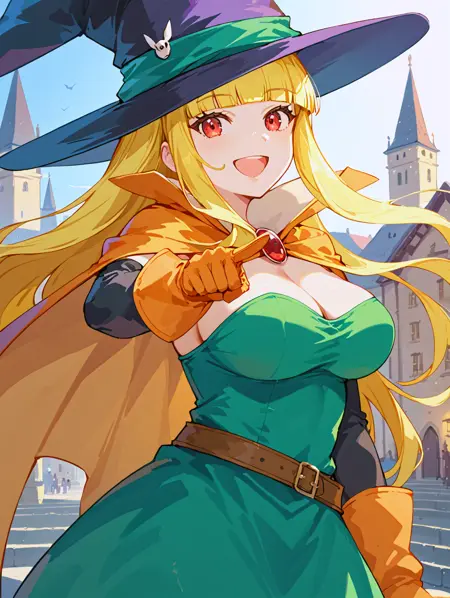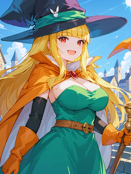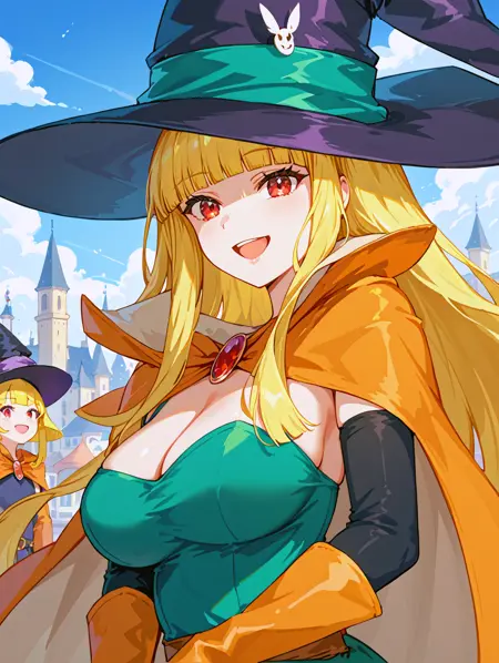 Alicetroemeria, blonde hair, long hair, blunt bangs, smile, open mouth, red eyes, green dress, cleavage, witch hat, orange gloves, orange cape, detached sleeves, black sleeves, large breasts,