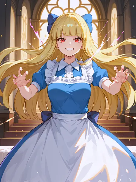Black_Alice, large breasts, red eyes, blue dress, apron, bow, red eyes, hair bow, blunt bangs, sidelocks, blunt sidelocks, blonde hair, long hair, aura, creepy, stuffed animal,