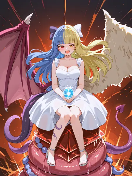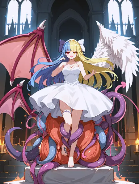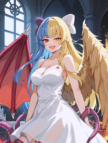 Chaos_Alice, large breasts, white dress, cleavage, bow, demon tail, yellow eye, red eye, (heterochromia), hair bow, wings, blunt bangs, monster girl, angel wings, demon wings, split-color hair, blue hair, blonde hair, long hair, tattoo, corruption, tentacle,
