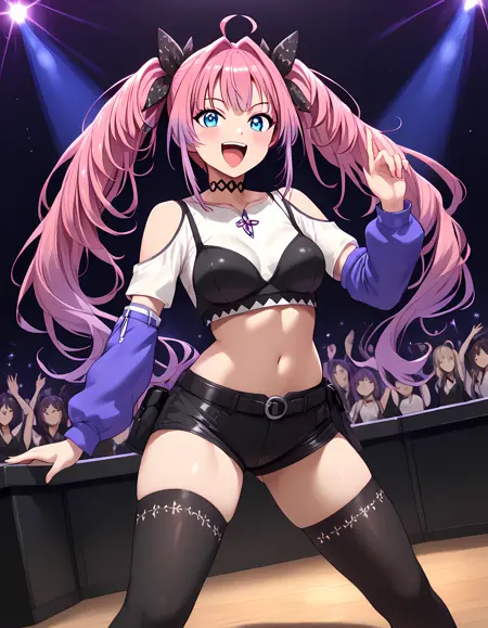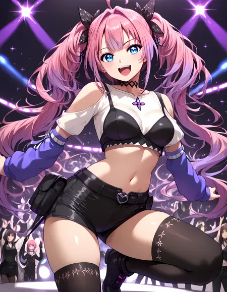 kikirara_vivi, 1girl, very long hair, pink hair, purple hair, gradient hair, hair ribbon, twintails, blue eyes, crop top, black thighhighs, black shorts, shoulder cutout