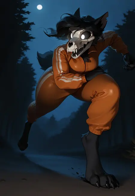 furry, 1girl, claws, orange jumpsuit, tiptoes, black fur, skull face, Mal0, fangs, canine teeth, MaloSCP, black hair, long hair, hair between eyes