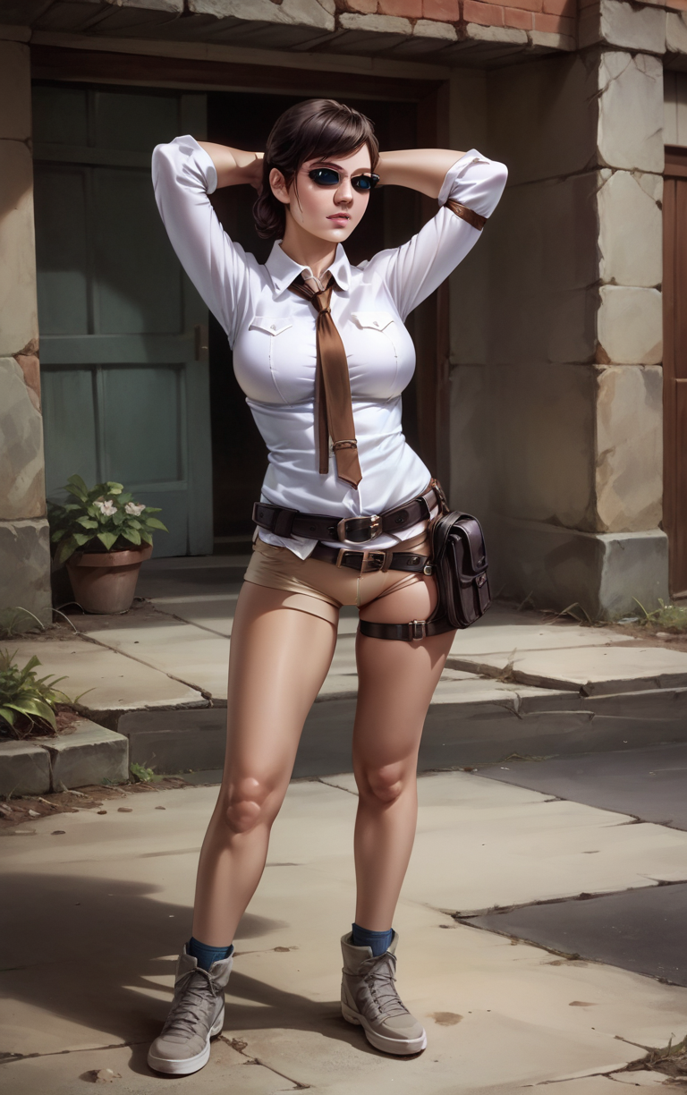 white shirt, collared shirt, shoulder holster, short shorts, brown shorts, brown necktie, sleeves rolled up, no pants, belt buckle, belt, thigh strap, arm strap, bare legs, holster, pouch,