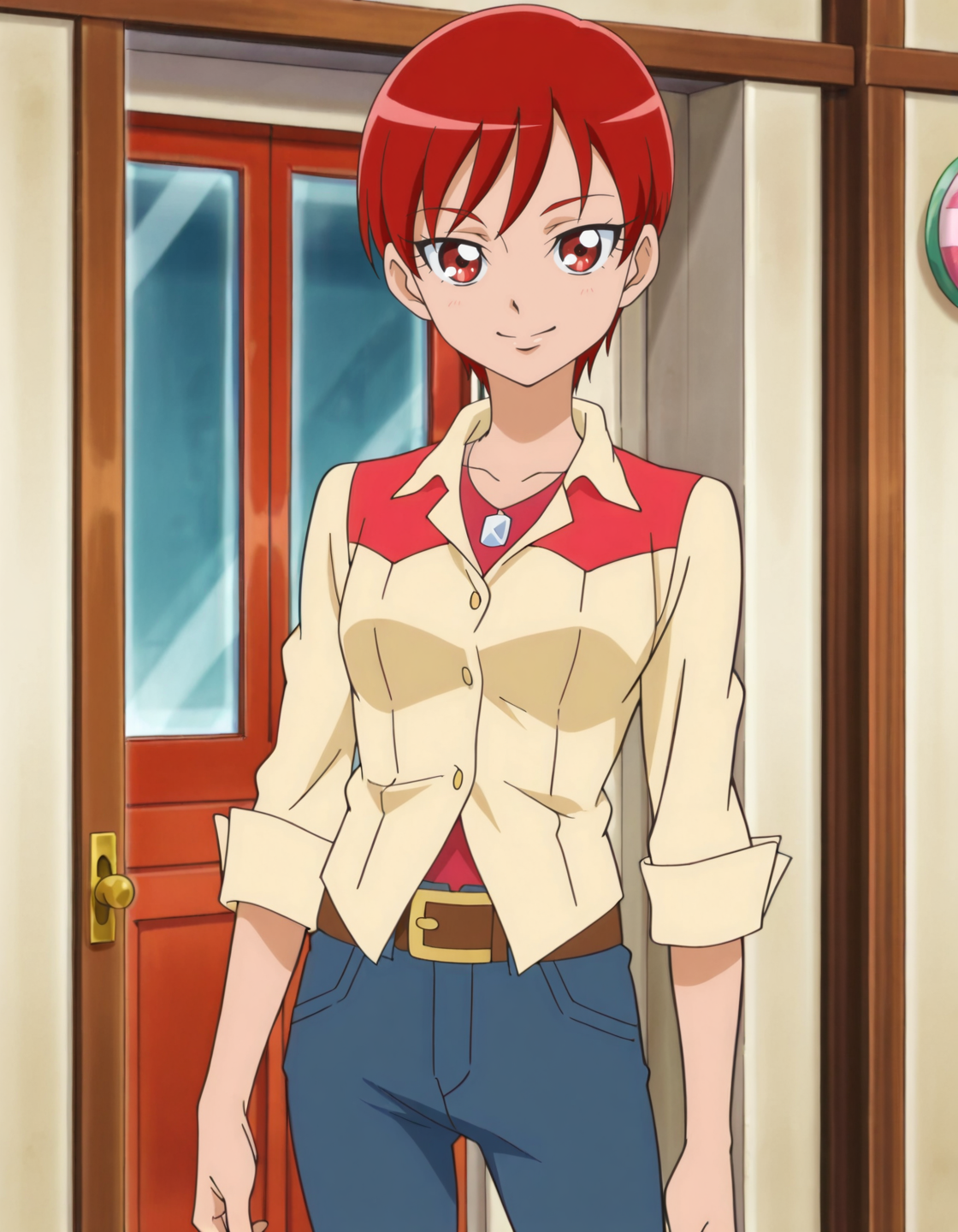 score_9, score_8_up, score_7_up, 애니메이션 스크린캡, 솔로, 1소녀, kenjouakira, 셔츠, 바지, 데님, 벨트, 청바지, 보석, lora:kenjouakira:0.8