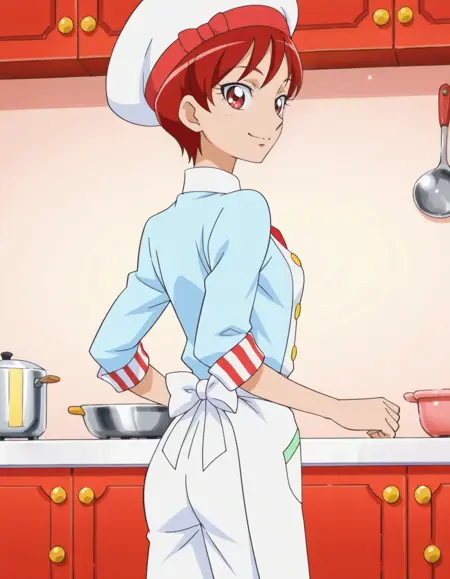 score_9, score_8_up, score_7_up, 애니메이션 스크린캡, 솔로, 1소녀, kenjouakira, 모자, 앞치마, 미소, 단추, 연한 파란 셔츠, 셰프, lora:kenjouakira:0.8